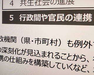 県が10月に発表したのは「和歌山県新総合計画【検討状況の中間報告】」。2040年ごろを展望した、「県政のめざす新たな指針となる総合計画」と位置付けられています。内容は多岐に渡り、人口減少や超高齢化・外国人との共生社会など5つの「潮流」が打ち出され、それぞれについて現状や対策を列挙しています。 その5つの潮流のひとつに挙げられているのが「行政間や官民の連携」です。今後は人口減少により、行政機関(市町村)は人員・財政が不足し、また地域でも、生活を支える民間サービスの撤退などが生じることが予測されるとしています。 そのため、これからは行政機関と企業やNPOなどとの連携が不可欠であり、「『公共』=『行政』という考え方は、改めていかなければなりません」とし、「官民の協働が『公共』にイノベーションを生み、皆で共創する『公共』こそが、持続的な公共を創る」などと述べています。 (1) (2) (3)