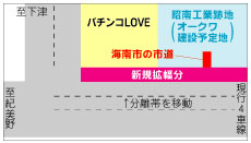 ![]() Yahoo!地図で見る また、昭南工業跡地の前を通る国道42号線が3車線に拡幅されることになり、既に一部工事が始まっています。 和歌山河川国道事務所によると、拡幅されるのは築地交差点(パチンコLOVEの角)〜コーナン海南店の間の42号線。現在の片側2車線ずつ・合計4車線を、1車線増やして3車線・2車線の合計5車線にするとしています。 完成は来年10〜11月頃を予定しており、ちょうどオークワ開業の時期と重なります。 また昭南工業跡地へは右折レーンが設けられることになっており、「おそらく信号もできるのではないか(同国道事務所)」とのことで、 [5]続き [6]前に戻る (1) (2) (3) (4) 次の記事 [4]iPhoneに500万