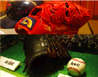 ▼海南市出身の土屋・南両投手のグラブを展示 わかやまスポーツ伝承館