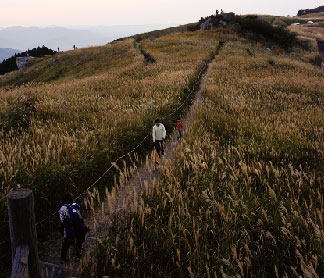 ▼ヤギのスミレちゃんもお出迎え 生石高原のススキが見頃