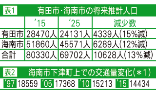 5年後に部分供用、8年後に供用開始? 有田海南道路は平成20年に事業化。 当初は今年、平成30年頃の完成を目標にしていましたが、計画は大幅に遅れています。 今年4月時点では用地進捗率は79%とかなり進んものの、事業進捗率は依然21%です。 完成予定については「まだ未定です(国交省近畿地方整備局)」となっていますが、国交省が昨年度に発表した資料(*1)では「費用の現在価値算定表(事業全体)」として、平成35年('23年)度に部分供用開始、平成38年('26年)度に供用開始として計算しており、この辺りの完成をメドにしているものと見られます。 人口13%減、交通量も? 供用前に、渋滞もある程度は解消か 国の将来推計人口(*2)によると、沿線自治体である有田市・海南市の人口は、'25年には'15年比でおよそ13%減少(表1)。 交通量も、有田海南道路のほぼ中間地点である下津町での計測で、'97年をピークに減少を続けています(表2)。 渋滞解消を主要な目的に開始された有田海南道路ですが、供用が開始される頃には、渋滞もある程度は自然解消されているーー事業が大幅に遅れたことにより、そういう状況になりそうな見通しです。